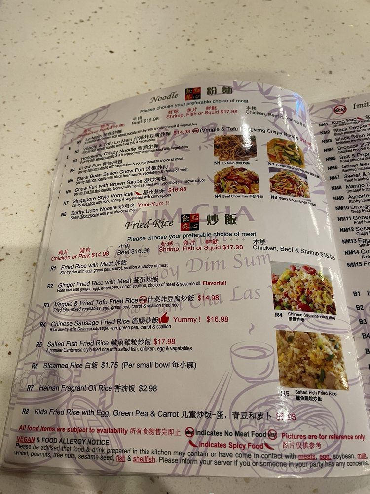 Yum Cha in Las Vegas specializes in traditional Cantonese cuisine, famous for its noodles and dim sum offerings. Located at 4945 W Tropicana Ave, this restaurant provides a casual dining experience with excellent service, offering vegan and vegetarian options. The diverse menu includes Chef Specialties like Stir-fry Sticky Rice Pork Sausage, Fried Shrimp Ball, and Curry Shrimp Rice Noodle, all priced reasonably. Customers praise the freshly made Golden Sand Lava Custard Bun, Shrimp Dumplings, and Crispy Eggplant. Despite some mixed reviews on certain dishes, overall, Yum Cha receives high marks for its flavorful food and quick service. With a nostalgic interior and efficient staff, Yum Cha stands out as a go-to spot in Vegas for delicious dim sum.